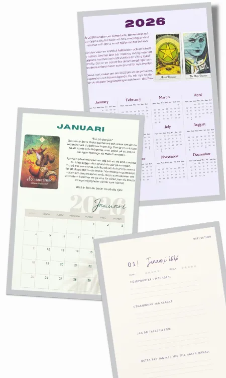 30 sidor PDF kalender med ny tarotvägledning för varje månad, samt 13 st reflektionssidor, en för varje månad, samt en årsammanfattning.